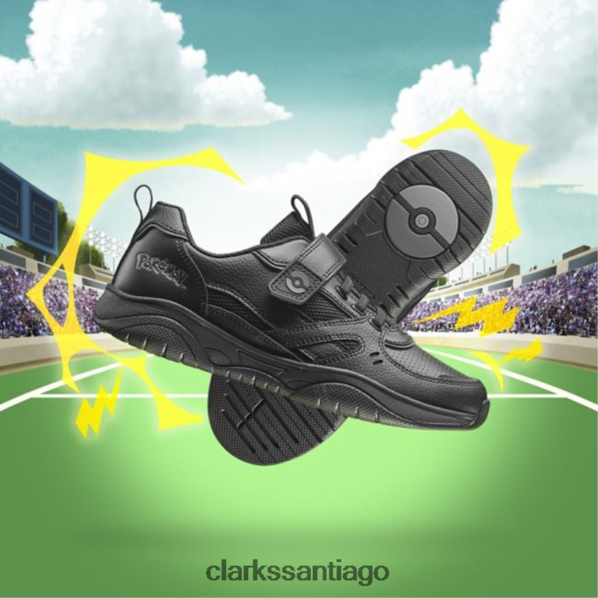 El fantástico comercio de agarre para zapatillas escolares es parte de nuestra nueva colección de Pokémon para niños de Clarks, ¡y les encantará! en cuero negro protector